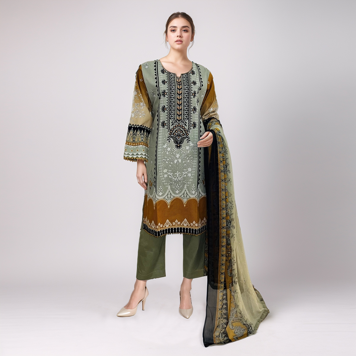 Whether you’re looking for stitched embroidered or printed suits in either 2-piece or 3-piece sets, we’ve got you covered. When it comes to customization, you decide whether you want a scarf/dupatta and trousers/shalwar; it’s entirely up to you.