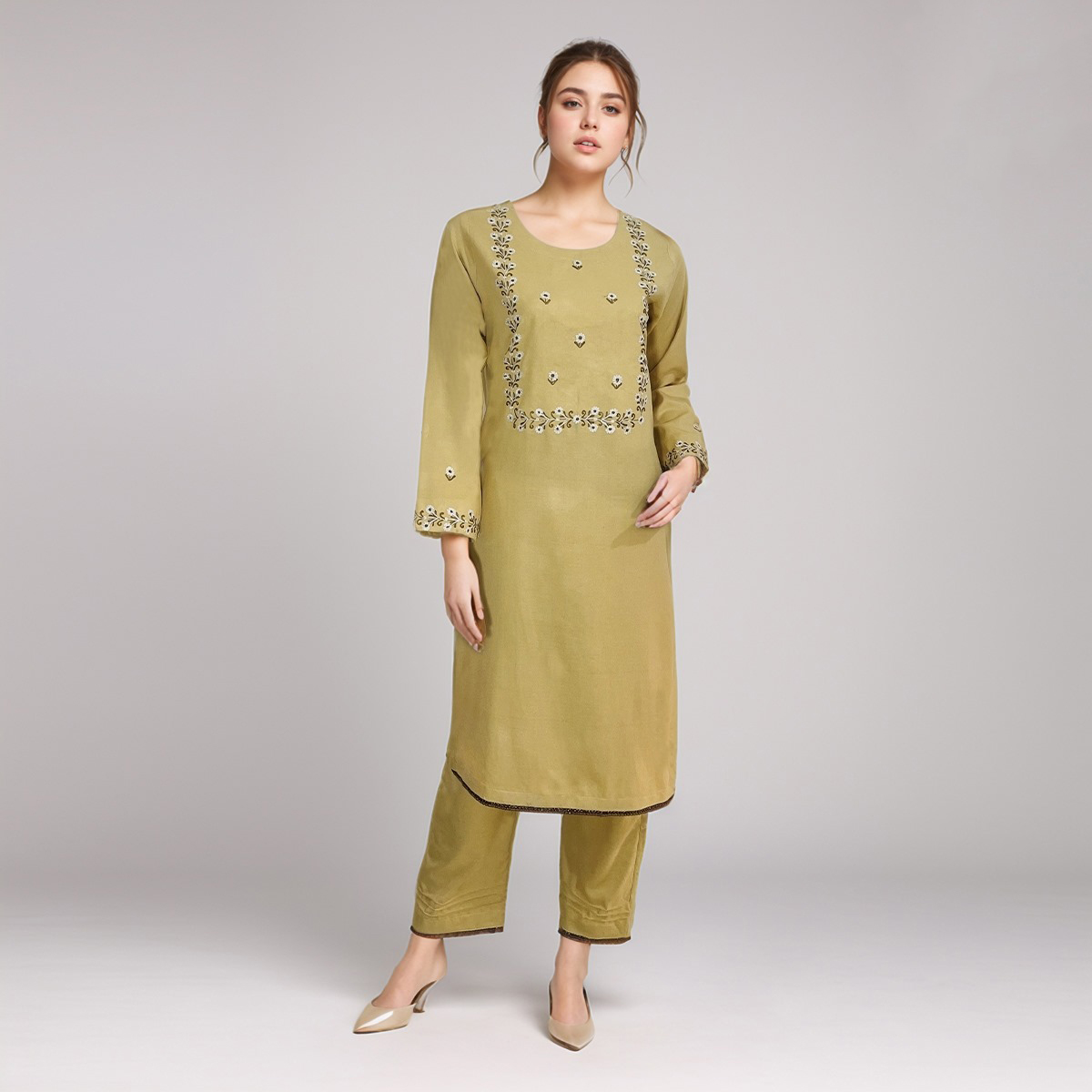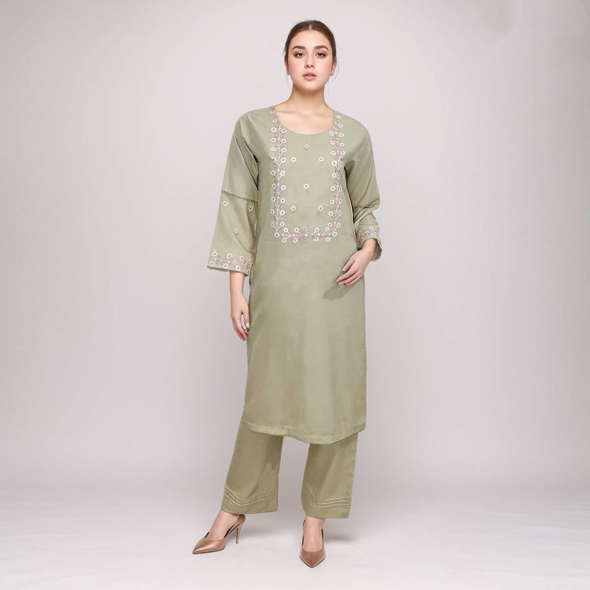 - Self-Print Designs: You’ll notice self-printing on the collar and front placket, executed with subtle detailing for a graceful look. Our designers use anchor thread to add delicate designs over the shalwar kameez.