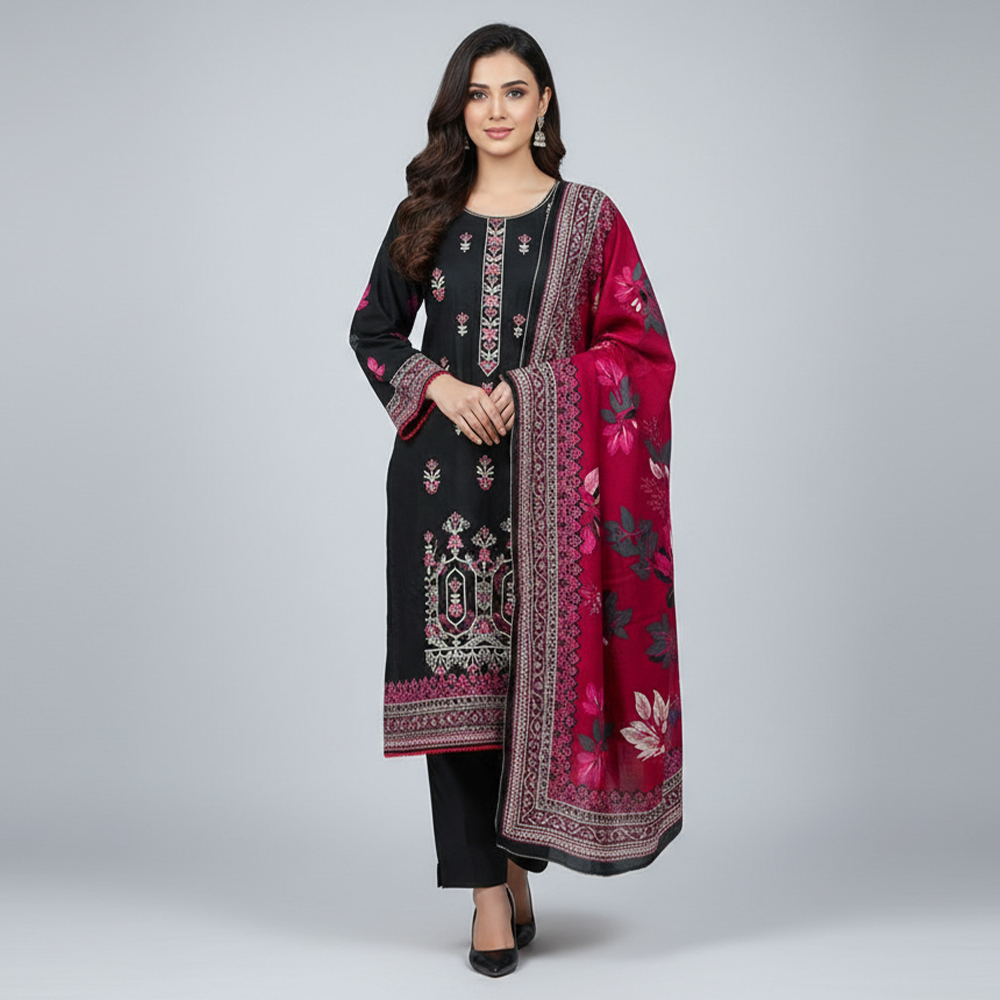 The Black Wholesale Linen Pakistani Suit Canada is a timeless and elegant choice designed for retailers seeking premium-quality ethnic wear with strong market demand. This beautifully crafted 3-piece stitched suit features a rich black color that delivers a classic, sophisticated look suitable for both day and evening wear. Made from soft linen fabric, it ensures breathability, comfort, and a graceful drape, making it ideal for seasonal collections in Canada.