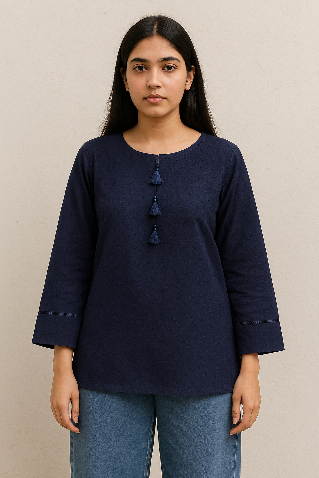 Lace embellishments and tassel details add a chic finish, making it ideal for pairing with jeans, palazzos, or classic trousers. Soft, breathable fabric ensures comfort, while expert stitching provides durability for long-lasting use. Available in all sizes, this kurti is perfect for casual outings, festive gatherings, or evening wear.