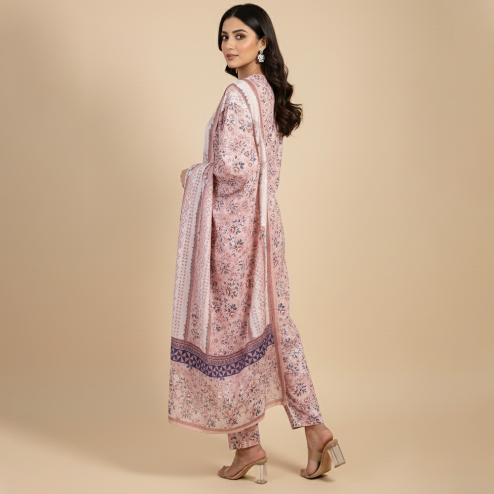 This ready-to-wear 3-piece set includes a printed lawn dupatta and a matching printed trouser, creating a complete and coordinated look for effortless styling. Designed to meet diverse customer preferences, the Oyster Pink Wholesale Bin Saeed Lawn Suit Canada is available in sizes S, M, L, and XL, making it suitable for a wide range of buyers.